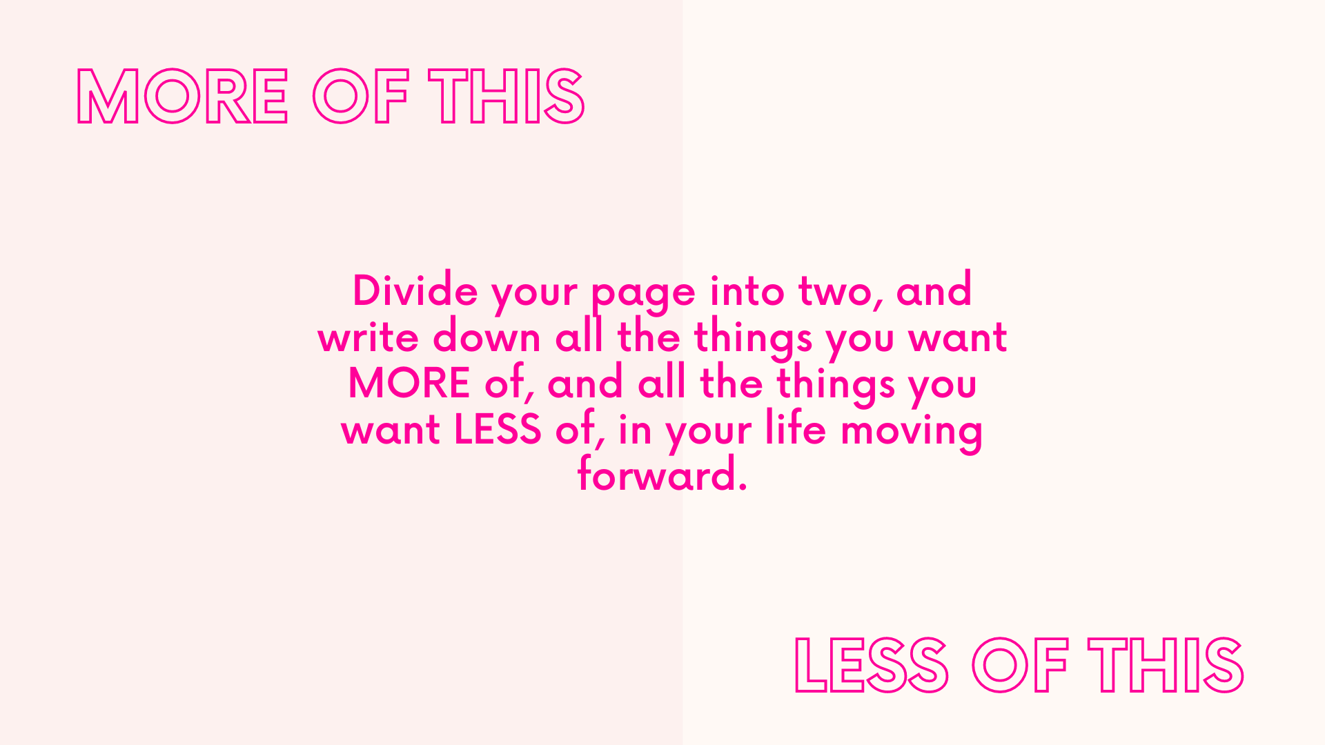 Now divide your notebook page into two halves. On one half, write ‘MORE’ and on the other write ‘LESS’. Start filling up each side of the page with things that you want more of, and things you want less of.